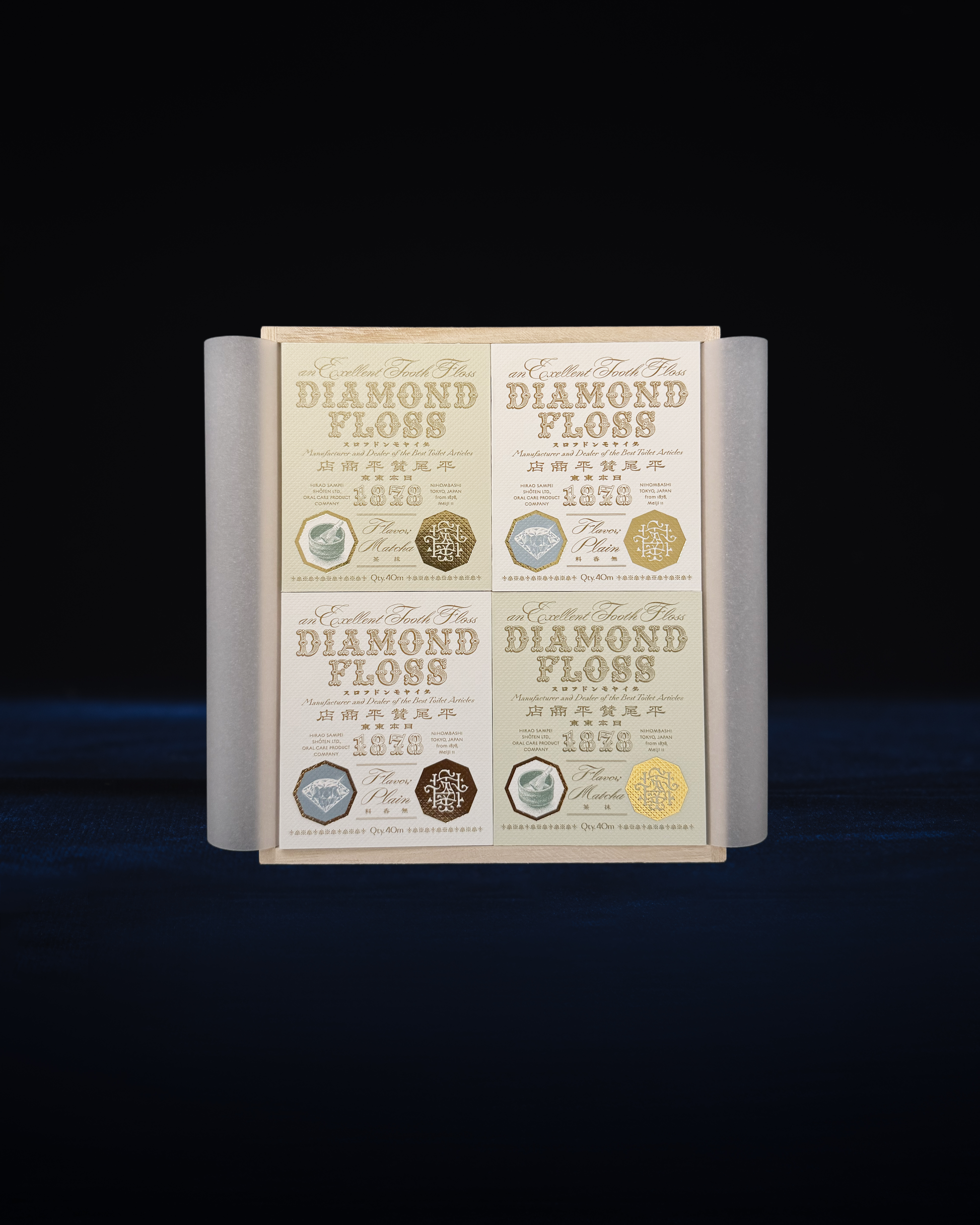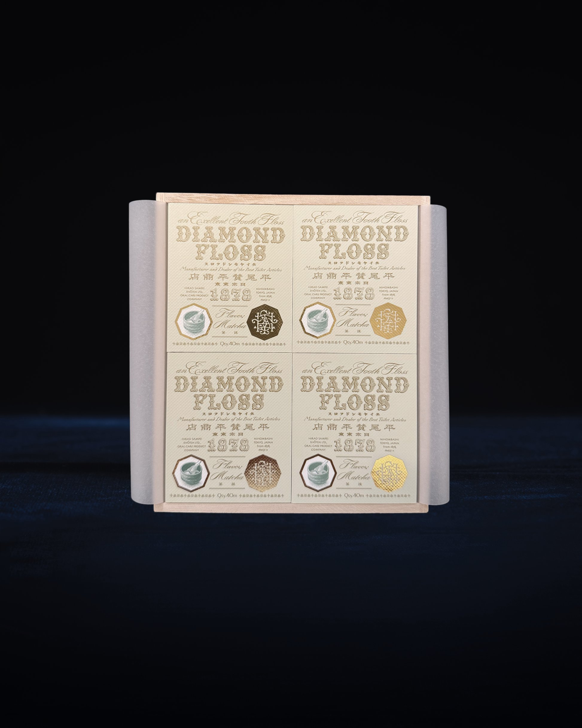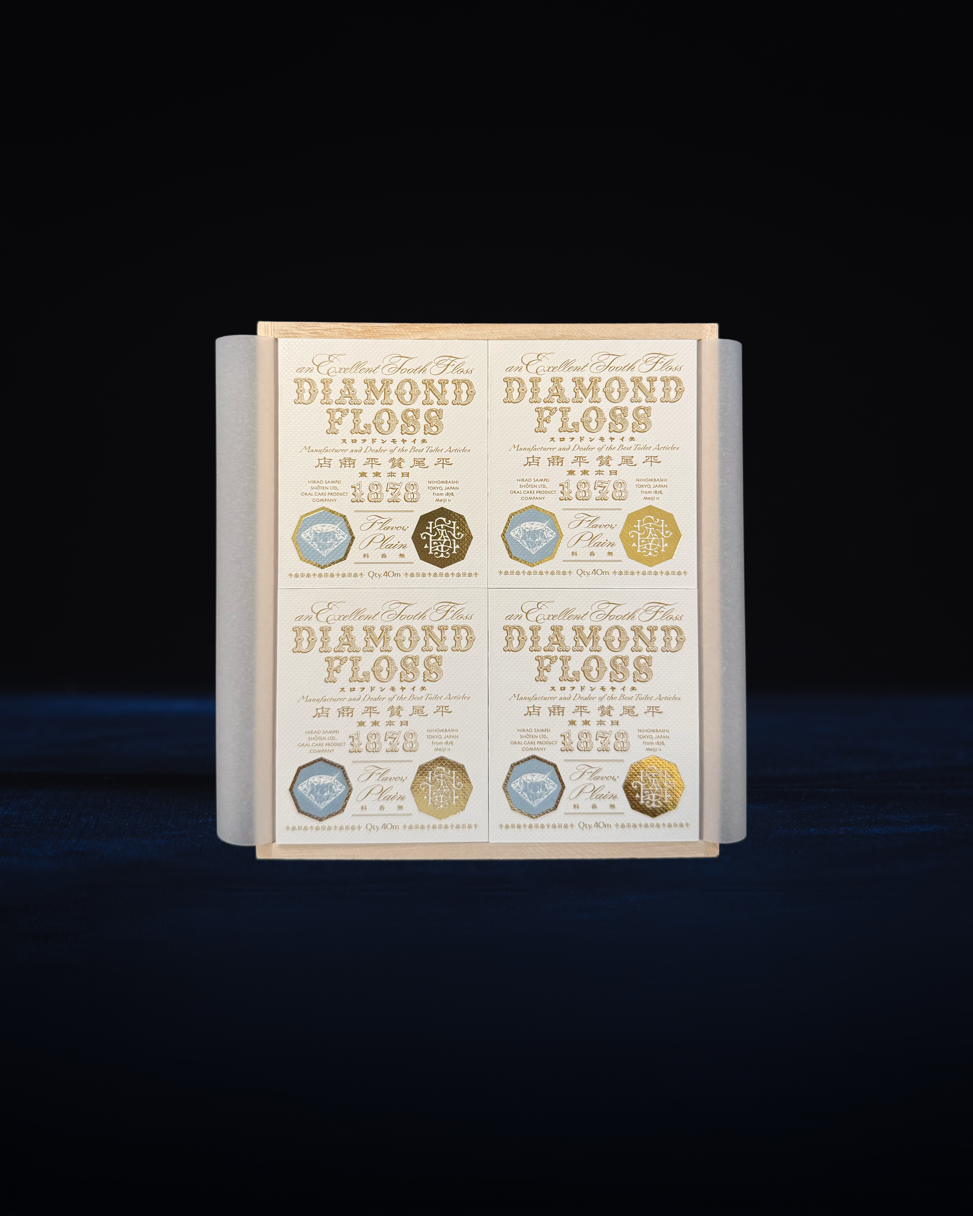 平尾賛平商店の刻印入りの桐箱に、薄葉紙で包んだ4個のダイヤモンドフロスを収納したギフトセットは、感謝や気遣いを上品に伝える贈り物にぴったりです。